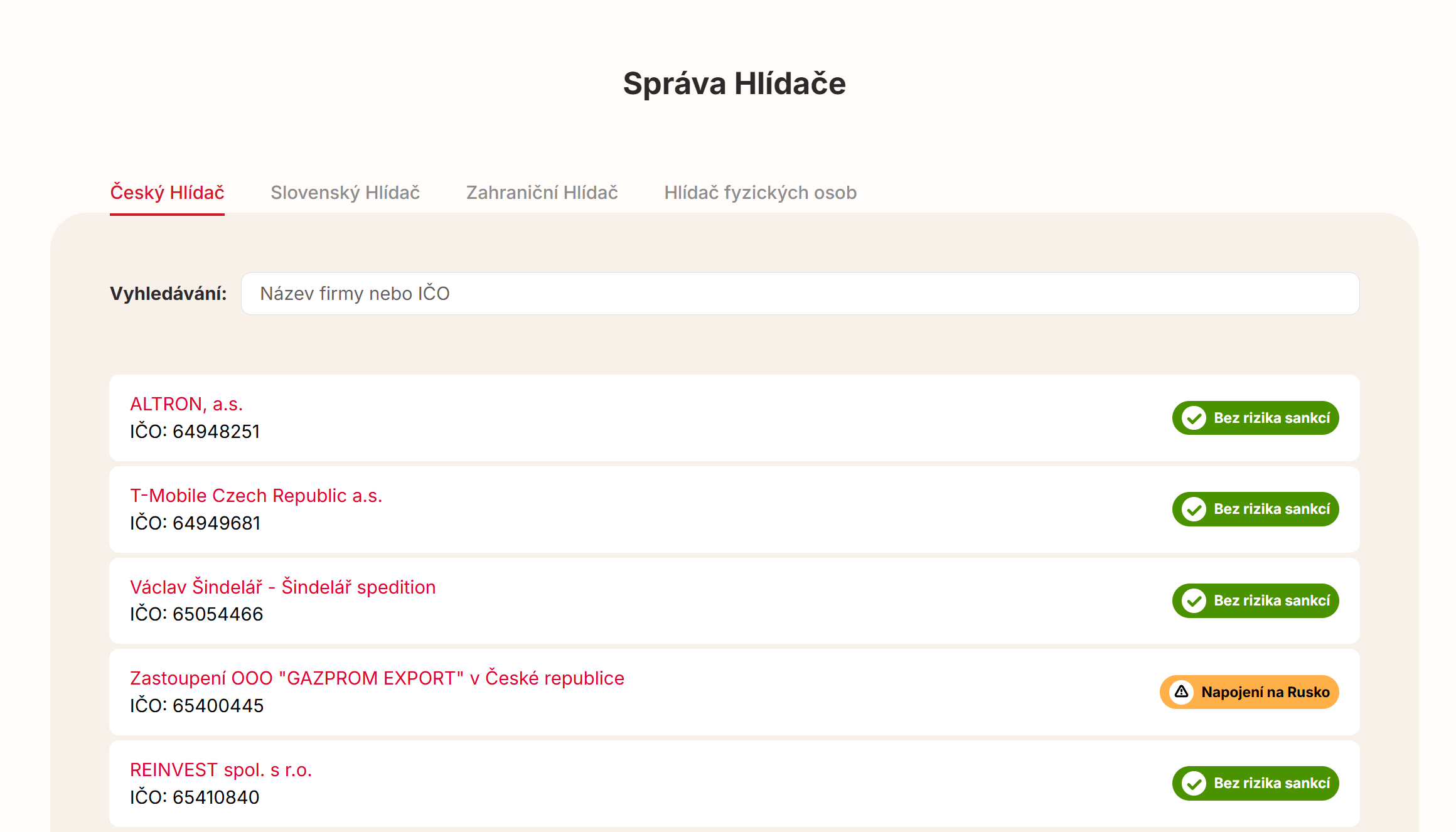 Hlídač sankcí - průběžně sleduje, zda vámi dříve kontrolované subjekty nespadly pod sankce. Nově do něj můžeme automaticky přidat každou firmu, se kterou uveřejníte smlouvu v registru smluv.